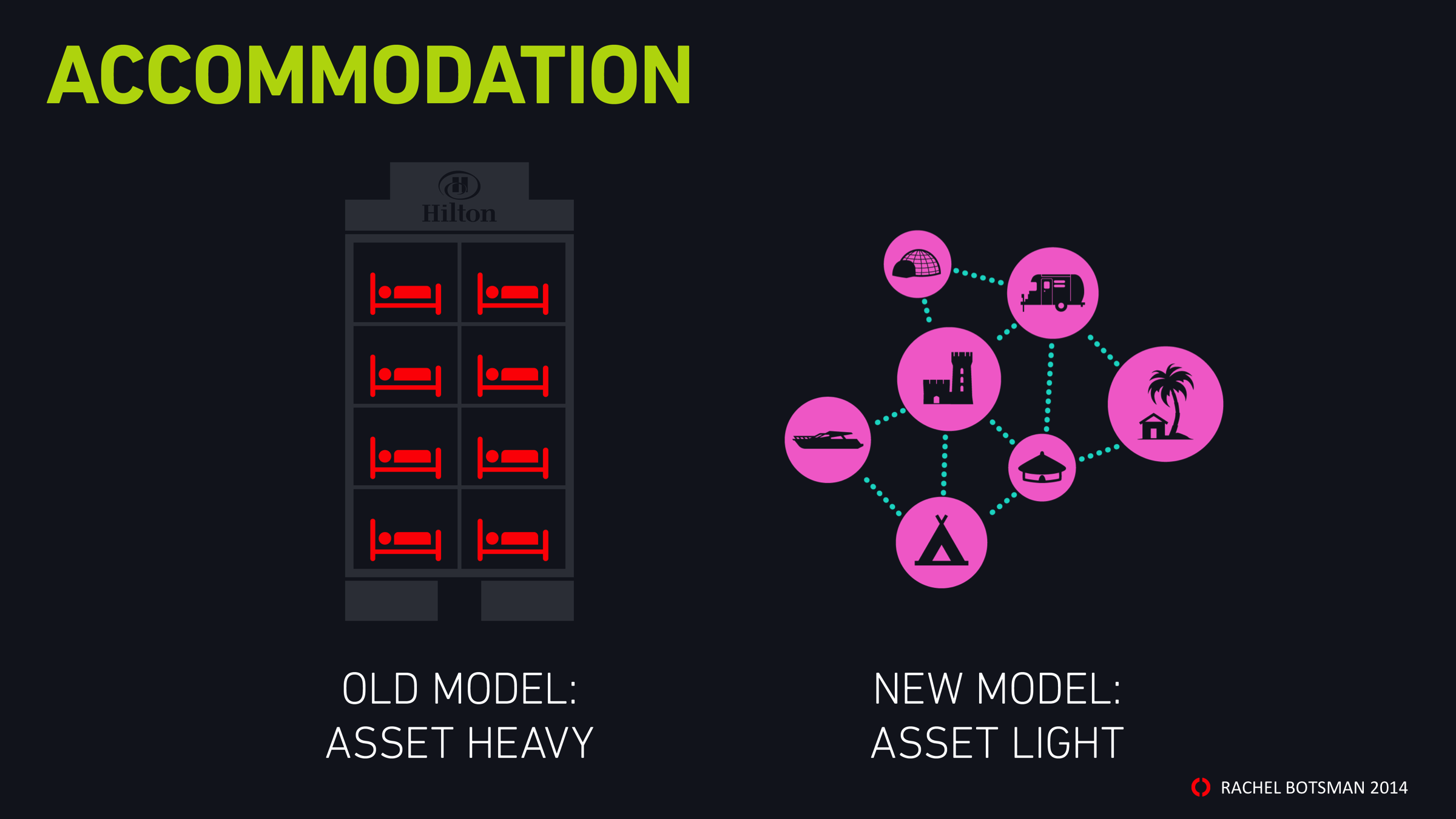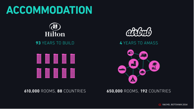 Goodwin verwijst naar een nieuw type organisatie die ondernemers in staat stelt om in no-time vanuit het niets marktleider te geworden in een segment. Niet door zelf een eigen materieel imperium op te bouwen, maar door gebruik te maken van de middelen van anderen. Op die manier kon volgens de quote van Goodwin Airbnb in een paar jaar de grootste accommodatie aanbieder te wereld worden, zonder ook maar één eigen accommodatie te bezitten en kon Uber het grootste taxibedrijf ter wereld worden zonder één eigen taxi. Rachel Botsman vatte dit mooi samen in de twee onderstaande slides: