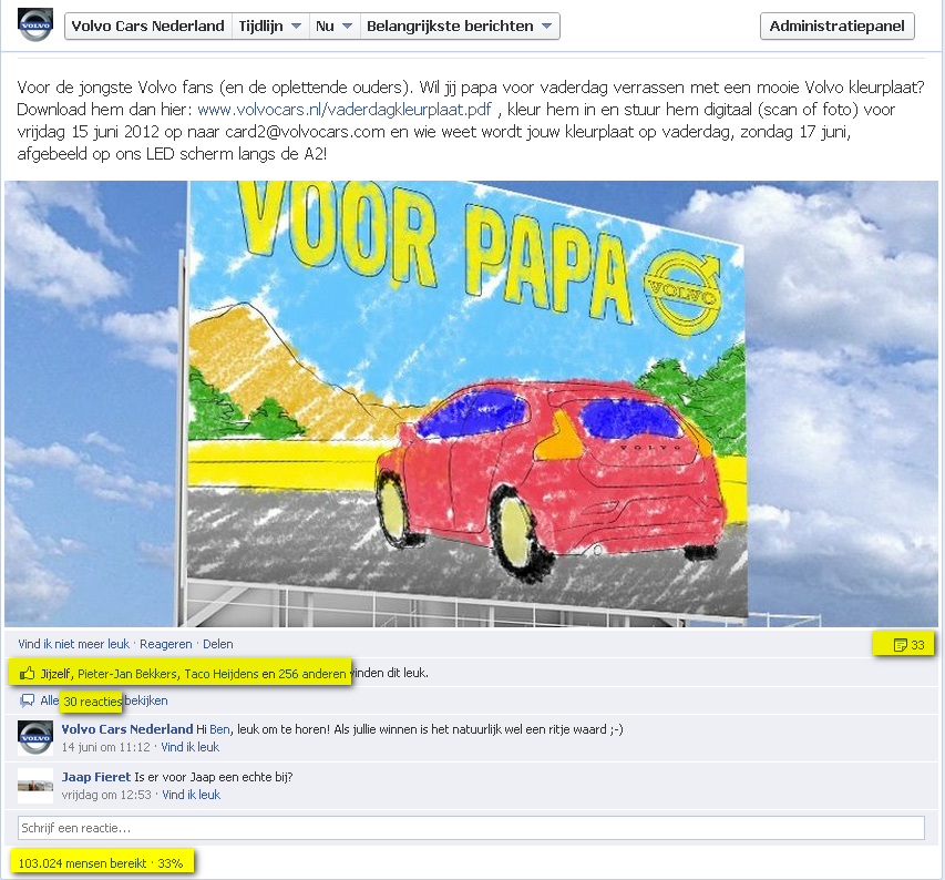 Speciaal voor papa konden kinderen via een link op de Facebook-pagina van Volvo Cars Nederland een kleurplaat downloaden, inkleuren en via e-mail insturen naar Volvo Nederland. De winnende kleurplaat was op vaderdag, zondag 17 juni 2012, te zien op het LED- scherm op een paal langs de A2, bij Beesd. Een campagne van 'online' Facebook naar 'offline' paal. De Facebook-pagina van Volvo Cars Nederland heeft inmiddels 17.412 fans en is geheel in eigen beheer. De salescompany bedenkt de campagnes in combinatie met EURORSCG 4D en Mindshare. Zo ook deze minicampagne.