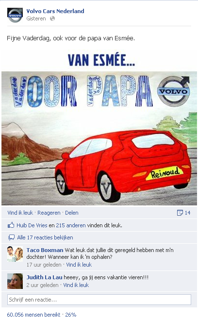 Volvo Cars Nederland heeft vaderdag als inzet voor een mini-Facebook-campagne. Volvo wil met deze actie haar marketingstrategie laten zien. Niet alleen de man of vrouw achter het stuur is belangrijk, maar ook hun omgeving, die bovendien vaak graag Volvo rijden. Want er is meer in het leven dan alleen de auto die Volvo heet. Mooi streven, maar was de campagne succesvol?