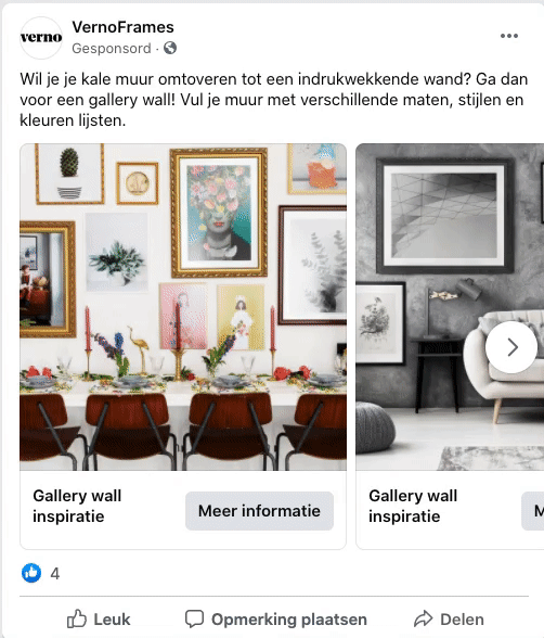 Met deze carrouseladvertenties kun je tot tien afbeeldingen (minimaal twee) in een dynamische carrousel plaatsen. Ook video’s kunnen in de advertenties gebruikt worden. Dit kan interessant zijn voor bedrijven die meerdere producten willen laten zien en promoten in één carrousel/advertentie.