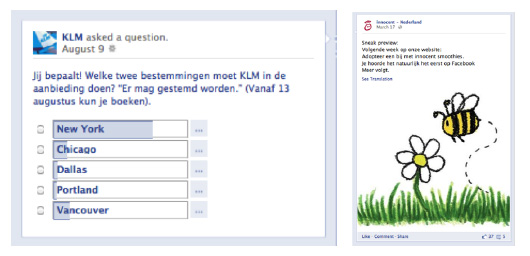 Facebook polls. Laat je fans met deze crowd-sourcing tool op hun voorkeur ‘stemmen’. Met onderstaande actie laat KLM haar fans zelfs een beetje mee beslissen over aanbiedingen.