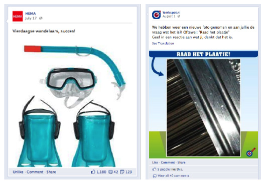 Raad het plaatje. ‘Wat of wie is het?’, ‘Zoek de verschillen?’ of ‘Waar zijn we?’. Zorg echter net als Werkspot.nl wel voor een goede koppeling met het merk of product.