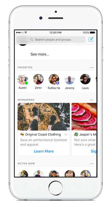 Zodra je Messenger opent, zie je jouw recente gevoerde gesprekken, met daaronder de actieve en favoriete vrienden. Daaronder staan de overige lopende gesprekken. Tussen de favoriete vrienden en het tweede deel van de lopende gesprekken test Facebook een carrousel met advertenties van verschillende adverteerders. De carrousel wordt onder de ‘vouw’ getoond, dus je moet wel iets scrollen om het helemaal te zien.