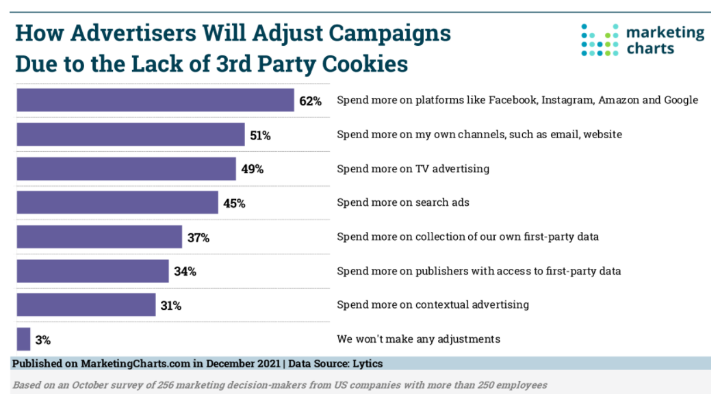 Om het gebrek aan het gebruik van third party cookies te compenseren, zeggen de respondenten hun advertentiecampagnes aan te gaan passen. De meesten zijn van plan meer geld uit te geven aan Facebook, Instagram, Amazon en Google (62%). In Amerika zijn deze bedrijven in 2021 samen goed voor bijna tweederde van de volledige igitale advertentie-inkomsten.