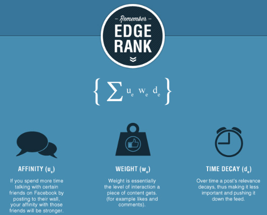 Facebook gebruikt de EdgeRank dus om updates op relevantie te wegen om zo te voorkomen dat gebruikers worden overladen door een gigantische hoos aan content. In dit zin fungeert de EdgeRank als een filter om iedere gebruiker het nieuws te tonen dat voor hem of haar het meest relevant is. Zodoende is uit onderzoek gebleken dat gemiddeld maar 17% van je fans een update van je pagina ziet. Om er zeker van te zijn dat veel van je fans jouw updates zien, zul je dus moeten zorgen voor updates die affiniteit (interactie) genereren, voldoende gewicht hebben en op het juiste tijdstip geplaatst worden.