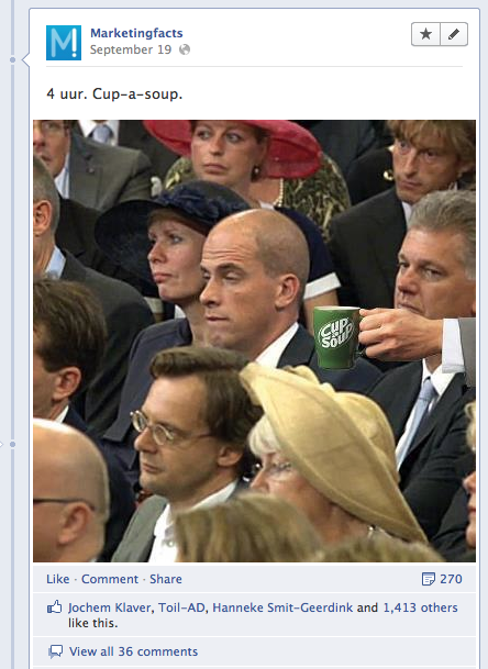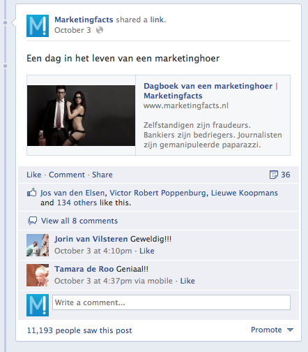 Op de Facebookpagina van Marketingfacts plaatsen we dan ook elke dag een likeable afbeelding. Dit varieert van leuke of foute advertenties tot internetmemes, webcare-fails, opvallende producten en inhakers. Zorg er wel voor dat afbeeldingen relevant zijn voor je merk of doelgroep.