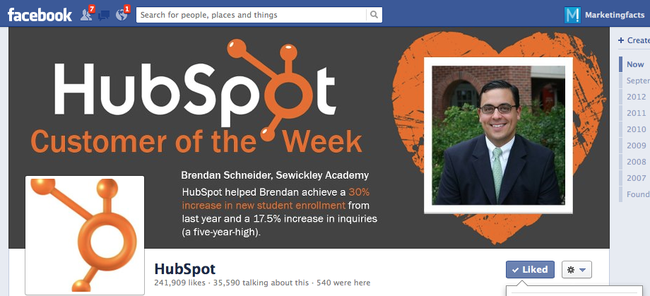Naast prijsvragen kun je ook andere acties organiseren om je fanbase te doen groeien. Zo plaatst Hubspot elke week een foto van de 'klant van de week' als omslagfoto.