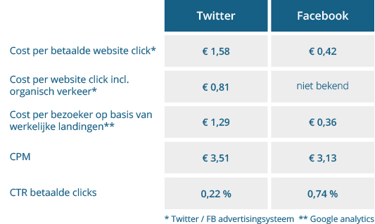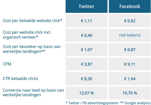 Interessant is ook het aantal daadwerkelijke landingen vanuit de advertenties op de webpagina. Bij Twitter landde 62 procent van de door het advertentiesysteem gerapporteerde clicks op de pagina, terwijl dat bij Facebook 118 procent was. Een afwijking van -20 procent tussen wat het advertentiesysteem aangeeft en wat Google Analytics aangeeft is hierbij als normaal te beschouwen.