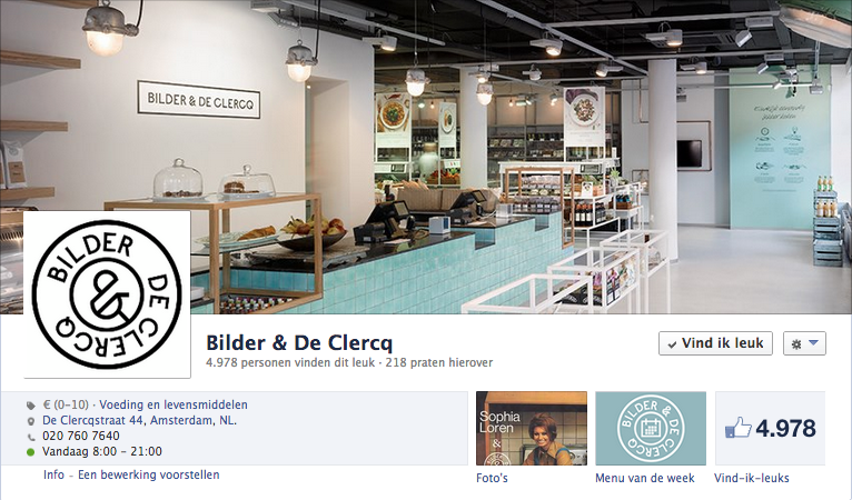 “De gloednieuwe winkel van Bilder & De Clerq in Amsterdam, waar je alle ingrediënten per gerecht kunt kopen, lukt het om 3 maanden na opening al meer dan 4,900 likes te hebben. Dit hebben ze heel slim aangepakt door reeds in januari 2012 te beginnen met het informeren van de potentiële consument. Het tekenen van het huurcontract voor de winkel in juli 2012, hun inspiratiebezoek aan Engeland in november 2012, de sleuteloverdracht in december 2012, uitgebreid verslag van de verbouwingen van het pand, het aannemen van nieuwe werknemers en natuurlijk alles omtrent de opening. Alle content gaat gepaard met zeer smakelijk beeld van de producten, de huisstijl en de winkel. De teksten zijn kort en enthousiast en overal is duidelijk goed over nagedacht”.