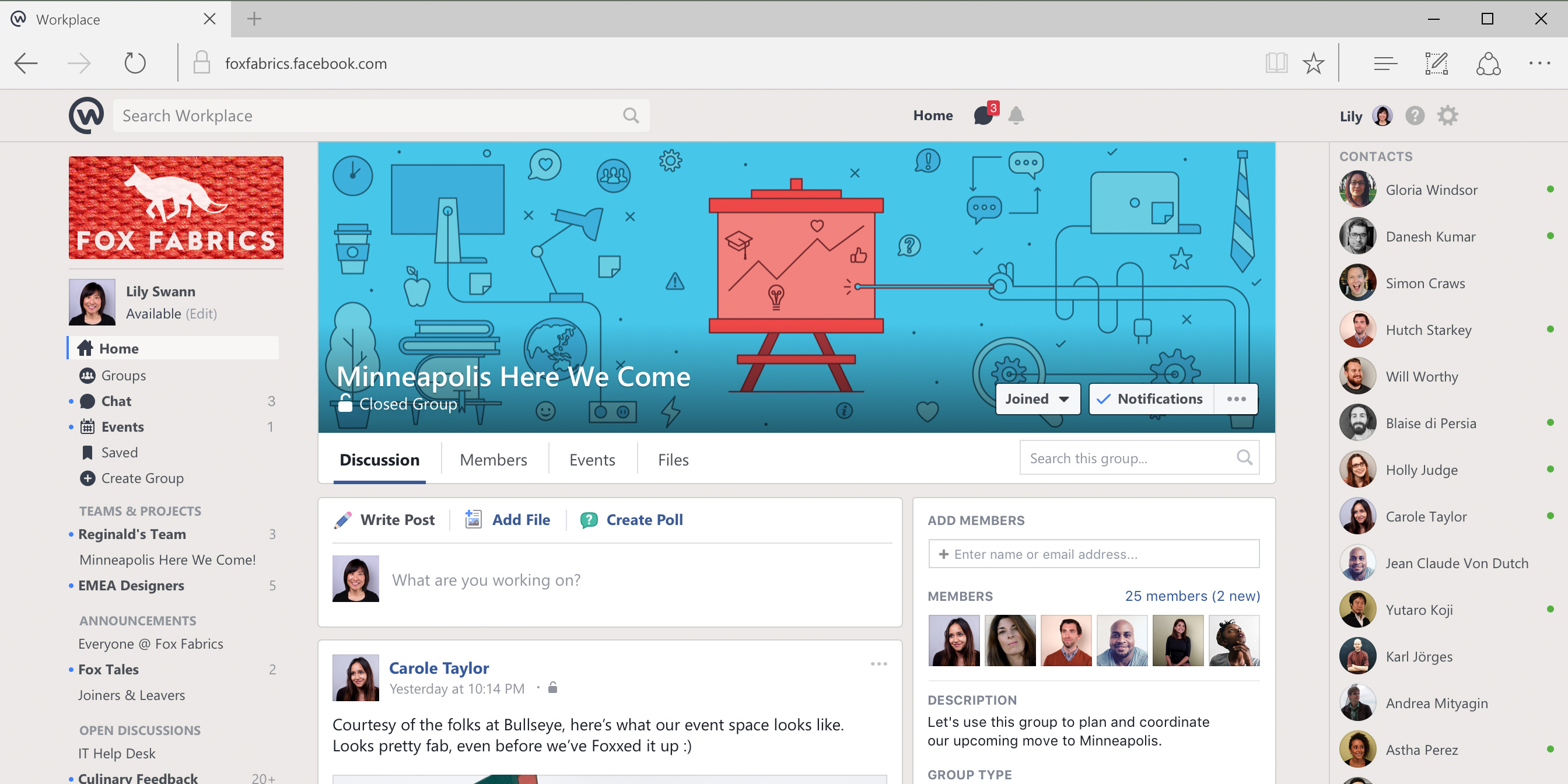 Facebook Workplace is een intern digitaal platform waarop medewerkers kunnen samenwerken en kennisdelen. Het brengt een hoop van de features van Yammer, Slack, Jive, Skype, Google Hangout en Google Drive samen: een persoonlijke tijdlijn, een profiel aanmaken, groepen starten, discussiëren, videobellen, openbaar en privé chatten, documenten, foto’s, video’s en evenementen delen. En net als op de ‘gewone’ Facebook is het ook mogelijk live videobeelden, van bijvoorbeeld evenementen en productlanceringen, te broadcasten in een groep.