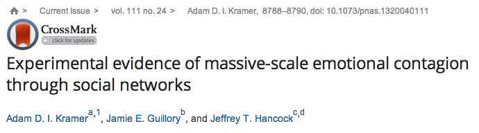 “We show, via a massive (N = 689,003) experiment on Facebook, that emotional states can be transferred to others via emotional contagion, leading people to experience the same emotions without their awareness. We provide experimental evidence that emotional contagion occurs without direct interaction between people (exposure to a friend expressing an emotion is sufficient), and in the complete absence of nonverbal cues.”