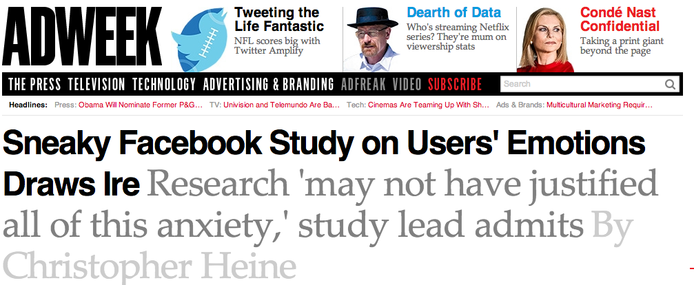 Soms lijkt het alsof de hele wereld in de overgang is. Eerst deze week een rel om die KLM “adios mechico”-tweet, toen die ongelukkige schwalbe van Robben en nu een nog veel grotere rel om een sneaky Facebook mind control experiment op meer dan 600.000 onwetende mensen. De Engelstalige media, zoals Adweek en The Wall Street Journal (bevat video), maar ook andere, staan er bol van. Is er echt iets aan de hand en zo ja, wat dan precies?