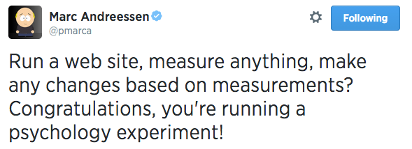 Ik vind de reactie van Marc Andreessen een hele goede. Daarnaast hebben ze nu eindelijk ‘echt’ een experiment uitgevoerd, niet met conditiegroepen waarvan men weet dat ze meedoen aan een onderzoek. De gegevens zijn nu een keer echt. Het ‘enge’ is dat Facebook hiermee direct bewijs heeft gevonden om ‘ons gebruikers’ te manipuleren, of zo lijkt het. Boeie, de AH doet het ook al jaren. Wil je dit niet zit dan niet op FB.