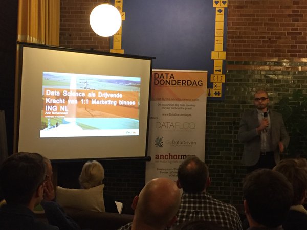 Na de ANWB was het de beurt aan Aziz Mohammadi, manager van het data scientist team bij de ING. Zijn verhaal ging over het nut en de werking van de 1:1 marketingmachine die ING ontwikkeld heeft. Bankieren is namelijk steeds meer een digitale business geworden en het soort contact is verschoven van outbound (ING initieert het contact) naar inbound (klant neemt zelf contact op met ING).