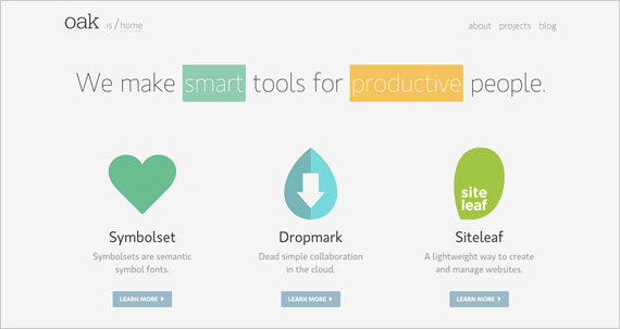 Oak maakt gebruik van een flat design met veel witruimte, typografie en kleur. De website is responsive en de inhoud gemakkelijk te schalen voor verschillende schermformaten.