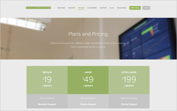 Geckoboard overtuigt door een flat en simplistisch ontwerp. Hun prijzen worden al op het eerste gezicht duidelijk.
