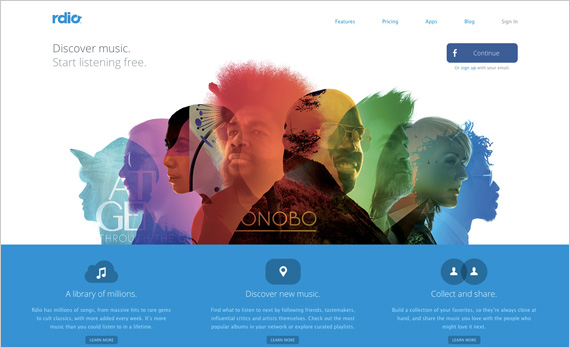 Rdio maakt gebruik van een flat design met vele verschillende kleuren en veel witruimte.