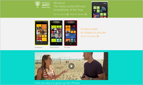 De Windows-telefoon-website toont het karakteristieke 'flat' Windows-ontwerp met veel kleur, typografie en een duidelijke structuur.