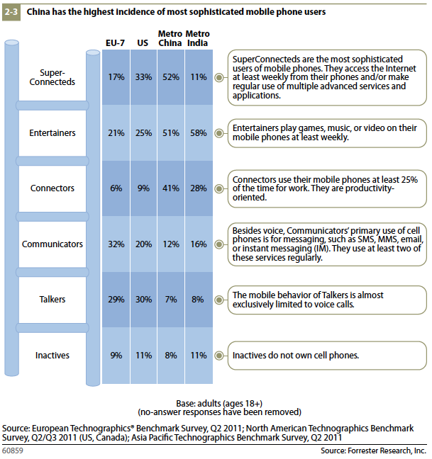 Zoals is te zien in het model kent Europa relatief weinig zeer intensieve smartphonegebruikers. Met name stedelijk China kent veel gebruikers die veel gebruikmaken van internet op hun telefoon. Waar we in Westerse landen veelal beschikken over een laptop of pc, is voor Chinezen de smartphone vaak het enige apparaat waarmee zij in verbinding staan met het web.