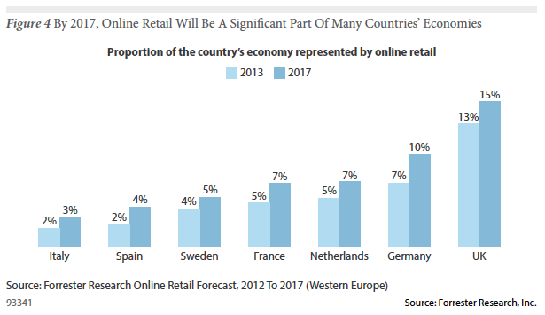 De grote Europese markten zoals Duitsland, het Verenigd Koninkrijk en Nederland zijn volwassen geworden. Er is sprake van een afvlakking van de penetratiegroei van online shopping. Voor Nederland verwacht Forrester dat online consumentenbestedingen zullen groeien tot 7 miljard in 2017. In 2012 was dat nog 4,6 miljard euro. Dat bekent een jaarlijkse groei van 9 procent. Dat is lager dan het Europees gemiddelde, maar zit op hetzelfde niveau als de VS, waar online ook al volwassen is. Het verzadigingsniveau is nog lang niet bereikt, maar voor volwassen markten zijn de booming-tijden voorbij. Daar uit voortvloeiend zal er meer aandacht gaan naar de customer journey, nieuwe touchpoints en zaken als personalisatie en conversie-optimalisatie.