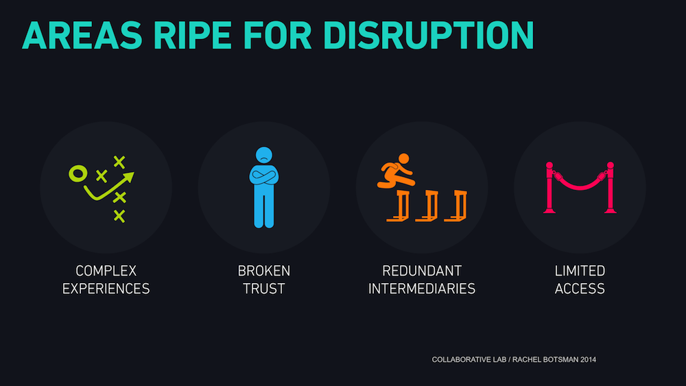 De markten waar dit soort marktplaatsen als eerst verschijnen zijn de markten waar de pijn voor de gebruiker het grootst is. Deze pijn wordt geadresseerd en vervolgens biedt het platform een tien keer betere ervaring, vaak tegen een concurrerend tarief. De Australische deeleconomiepionier Rachel Botsman presenteerde al in 2014 haar “areas ripe for disruption“, waarin ze uitlegt welke markten vanuit een consumentenperspectief naar haar mening ‘rijp zijn voor disruptie’.