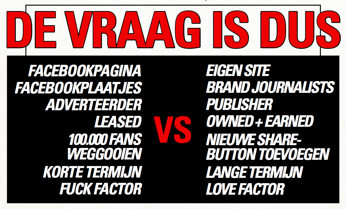 Ga je voor een leased Facebookpagina, waarbij je afhankelijk bent van de grillen van Facebook en steeds meer paid moet inzetten om je eigen fans te bereiken? Of ga je voor een echt owned platform met earned bereik? Investeer je in de korte of de lange termijn? En stel: Facebook verdwijnt. Ga je dan al je fans weggooien, of zet je gewoon een nieuwe share button op je artikelpagina?