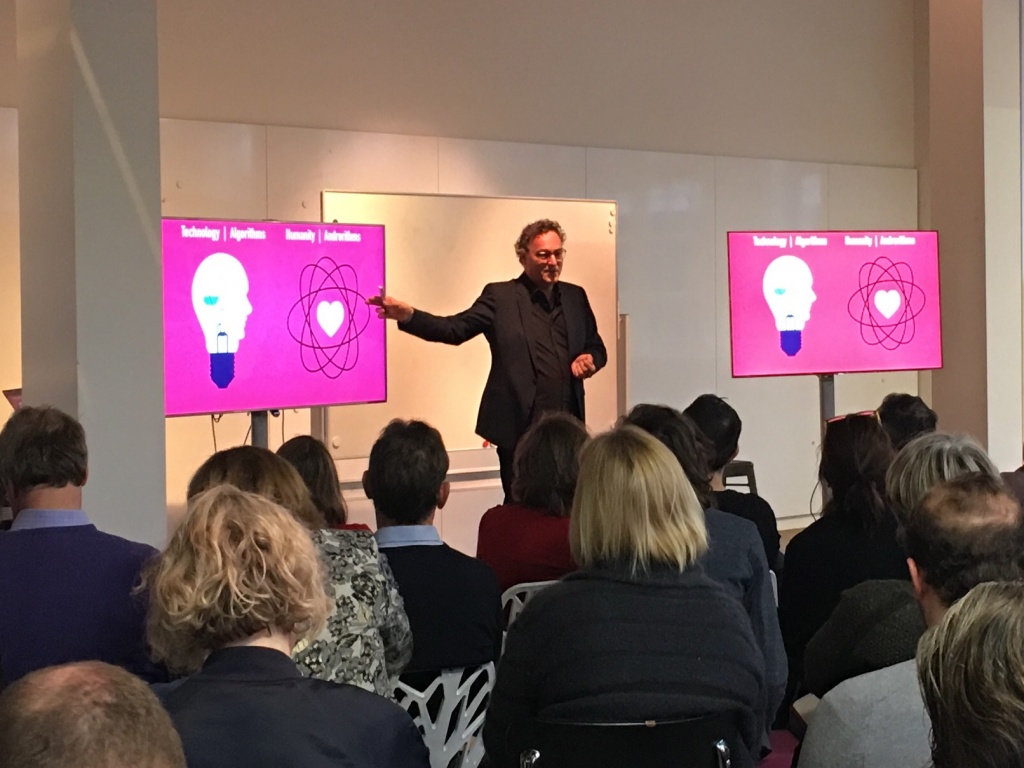 De pessimistische titel van zijn boek blijkt te zijn aangepast door de uitgeverij. Leonhard zelf had ‘vs.’ liever vervangen door het saamhorige ‘and’. Want waar anderen al snel doemdenken over de gevaren van Artificial Intelligence, ziet Leonhard de mogelijkheden die technologie kan bieden voor de maatschappij. Hij spreekt tijdens the Dutch Future Society over de mensheid en technologie en geeft aan dat we ons op het omslagpunt bevinden van de exponentiële groei in technologische ontwikkelingen. In de komende tien jaar zal kunstmatige intelligentie de menselijke intelligentie voorbij streven. Mens en machine zullen steeds verder integreren om menselijke functies te verbeteren. Denk hierbij aan in de hersenen geïmplanteerde personal assistents en volledig functionerende kunstorganen en protheses.