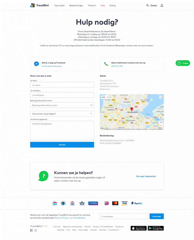 Zorg er voor dat de verschillende manieren om in contact te komen overzichtelijk gepresenteerd worden. Waar de ene bezoeker graag belt, stuurt de ander liever een chatbericht. Wanneer alle contactmogelijkheden zichtbaar zijn, sluit je geen bezoekers uit en laat je zien dat je op allerlei manieren te bereiken bent. TravelBird past dit goed toe: