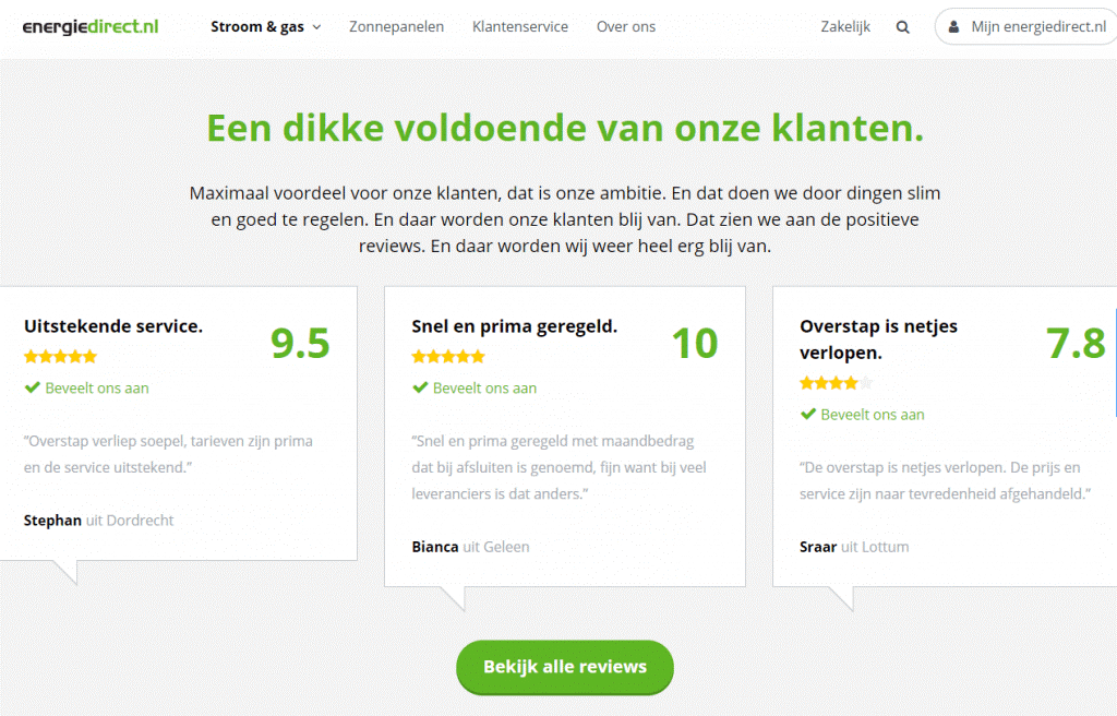 Naast verhalen van medewerkers, zijn verhalen van klanten essentieel op de ‘Over ons’-pagina. Bezoekers zijn gevoelig voor sociale bewijskracht en eerder geneigd om te converteren als anderen hebben aangegeven het merk te vertrouwen en het goed beoordelen.