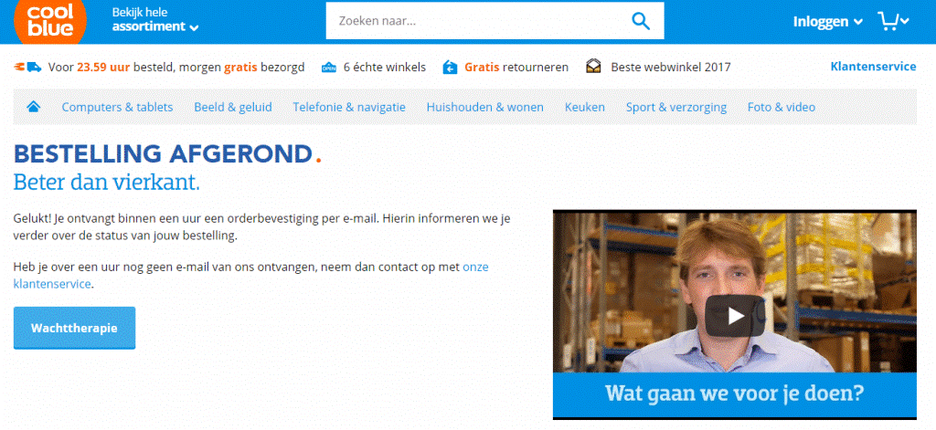 Het kan natuurlijk zo zijn dat de klant na de aankoop of aanvraag bepaalde zaken wil checken over bijvoorbeeld levertijd, voorwaarden et cetera. Zorg daarom dat de FAQ wordt getoond op de bedankpagina. Of leg, zoals Coolblue doet, in een video uit wat er na de bestelling gebeurt.