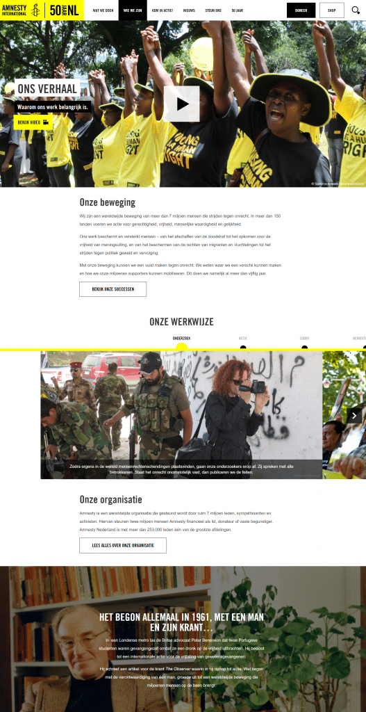Storytelling is een krachtige manier om je merk kracht bij te zetten. Bezoekers die de ‘Over ons’-pagina bezoeken, willen meer weten over het merk. Vertel hier dus je verhaal. Amnesty International is hier een erg mooi voorbeeld van: