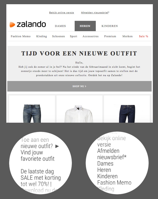 Zoals in bovenstaand voorbeeld te zien is, heeft deze weergave grote gevolgen voor de leesbaarheid van de e-mail. Het onderwerp en de preheader zijn duidelijk leesbaar. De ‘online versie’-tekst en het navigatiemenu zorgen vervolgens voor een grote hoeveelheid tekst waar de lezer weinig aan heeft. Daarna volgt pas de belangrijkste content van de e-mail.