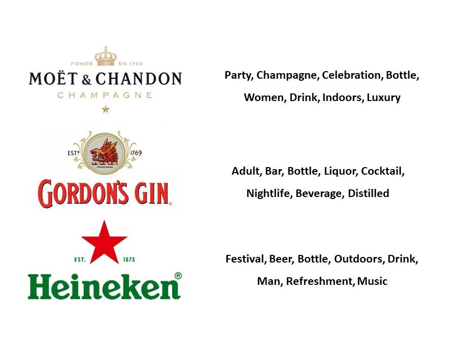 Afbeelding 1. Bovenstaande termen komen uit een computer vision-analyse van Instagramfoto’s waarin de merken Moët & Chandon, Gordon’s Gin of Heineken zijn getagd.