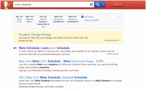 Zoeken naar het aankomende programma van de New York Mets, levert in Google als eerste een advertentie op van StubHub voor de verkoop van tickets. DuckDuckGo toont echter meteen de wedstrijdagenda van de New York Mets. Precies waar de zoeker naar op zoek is.
