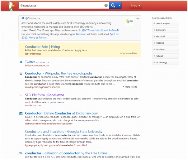 Een ander goed voorbeeld is de integratie van Social Media in DuckDuckGo. Wanneer er naar een account gezocht wordt, geeft DuckDuckGo direct de informatie waar de bezoeker naar op zoek is.