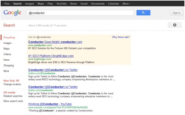 Daarnaast met het @ teken. Misschien wil ik wel helemaal niet dat Twitter als eerste boven aanstaat. Wie zegt dat Twitter het @ teken claimed? Via Facebook en Google+ kun je ook het @ teken gebruiken voor de naam van iemand. Wat als je zoekt naar een bedrijfsnaam die begint met een @? Moet je dan ook eerst Twitter krijgen?