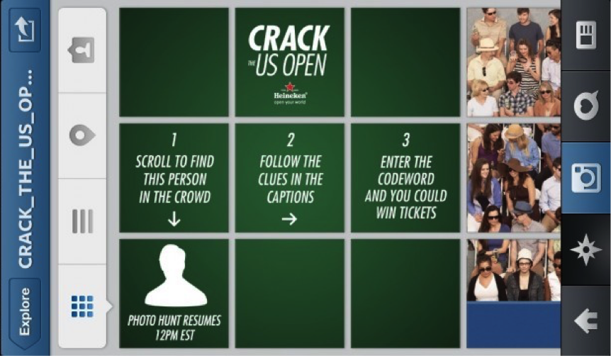 Dat investeren van tijd deden ruim 1.500 deelnemers op een speciaal Instagram-account van Heineken USA tijdens de US Open: Crack the US Open. Meer dan 200 foto’s creëerden samen een mozaïek van het publiek bij een tenniswedstrijd. Volgers volgden aanwijzingen in de foto’s en de bijschriften om zo stap voor stap de laatste foto te vinden, de code te kraken en wedstrijdkaarten te winnen.