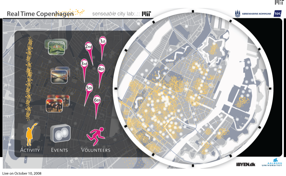 Schematische weergave van een crisiskaart (oranje) waarin metingen door burgers in de stad en activiteiten in kaart worden gebracht en vrijwilligers (volunteers, paars) gericht ingezet kunnen worden om hulp te verlenen (bron: Real-Time Copenhagen, 2008)