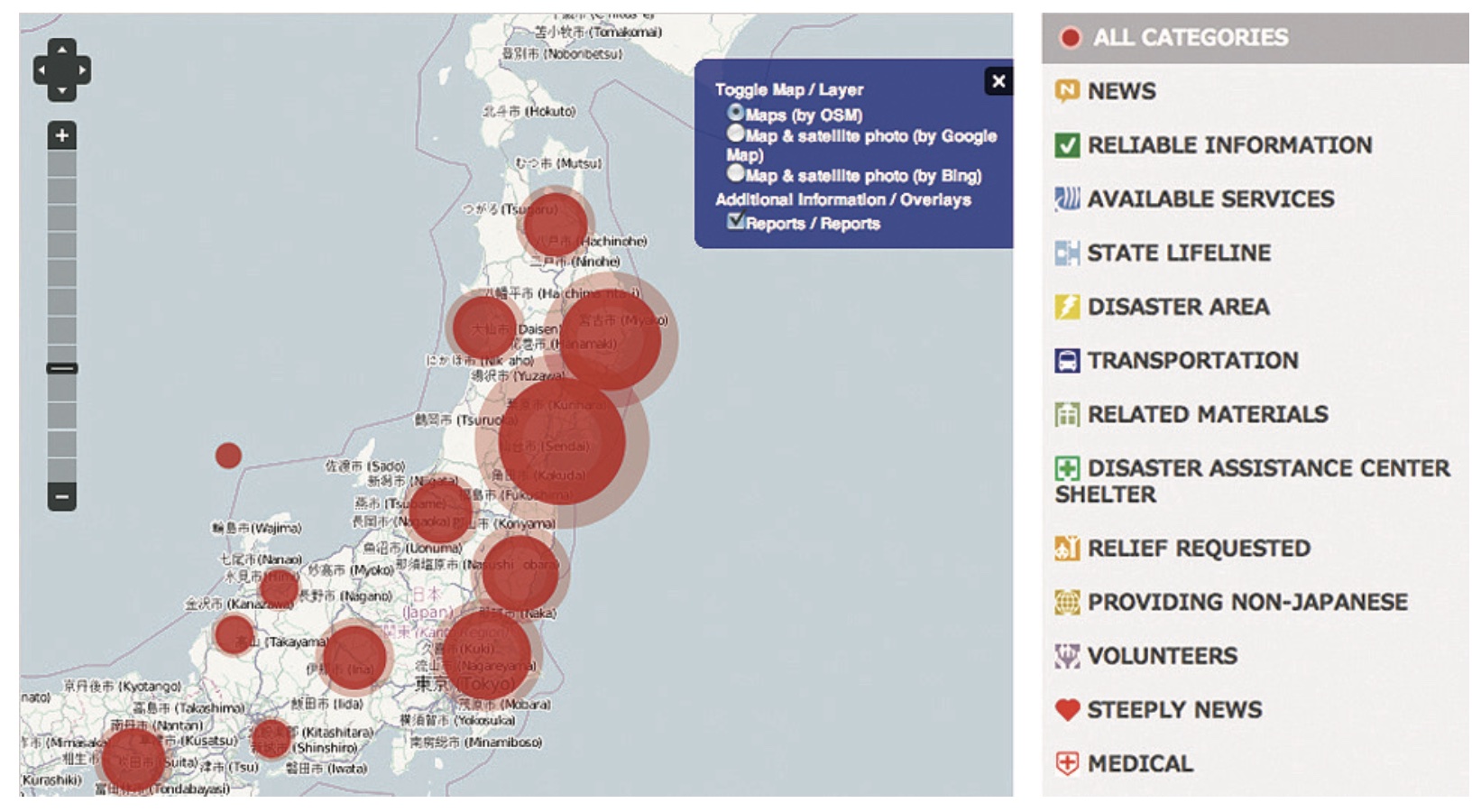 Screenshot van de crisiskaart van het door tsunami getroffen Japan met daarin de locaties van ramp en hulp, zoals beschreven in de tekst (bron: Ushahidi, 2010)