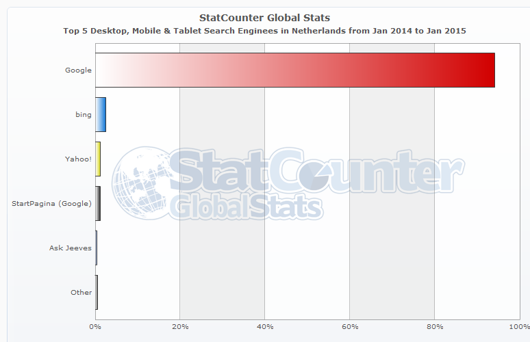 Volgens de cijfers van StatCounter is de dominantie van Google nog groter. Het aandeel van Google is 94 procent. Startpagina is pas op de 4e plek terug te vinden met een marktaandeel van 1,19 procent. In plaats daarvan is Bing met 2,56 procent op plek twee te vinden, gevolg door Yahoo! met 1,25 procent.