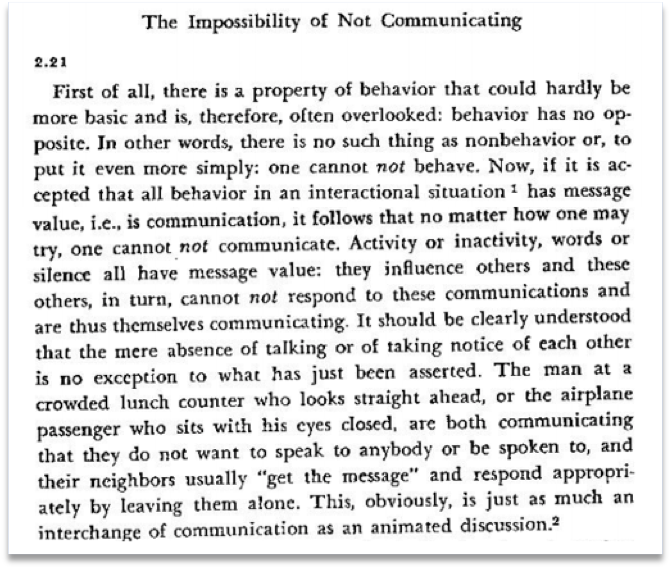 Watzlawick, P., Bavelas, J. B., & Jackson, D. D. (1968). ‘Pragmatics of human communication: A study of interactional patterns, pathologies and paradoxes.’ WW Norton & Company.
