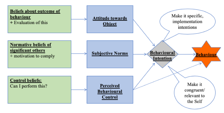 Eerst maar een model dus. En ja, geen enkel model vat de werkelijkheid, maar sommigen zijn toch echt nuttiger dan anderen. Hieronder zie je een aangepaste weergave van de theory of planned behaviour.