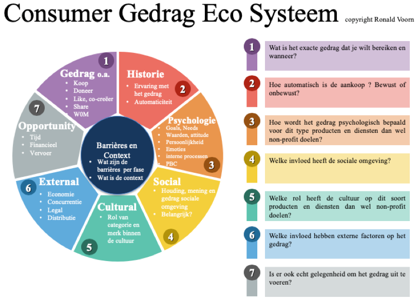 Een ander model om gedrag van mensen mee te vangen en analyseren is op basis van het consumer behaviour ecosysteem dat ik ontwikkelde (onder andere gebaseerd op de theory of planned behaviour). De stappen wijzen zich vanzelf. Waarmee ik niet wil zeggen dat het niet complex kan zijn. Maar hoe beter de analyse, hoe hoger de kans dat de goede instrumenten worden gekozen en ook goed worden ingevuld.