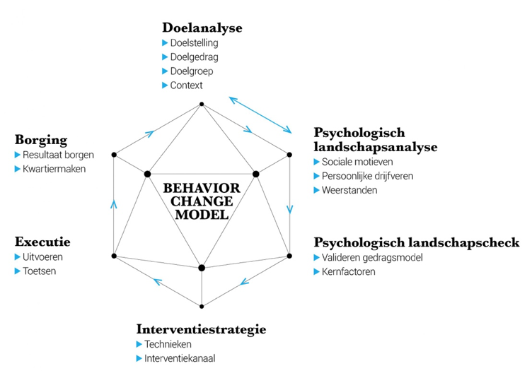 Weten welk gedrag of welk onderdeel daarvan je precies bij wie wilt beïnvloeden is dus key. Daar begint alles mee. Verder zijn de vervolgstappen vrij simpel, zoals bijvoorbeeld ook in het model van de Behaviour Change Academy wordt weergegeven:
