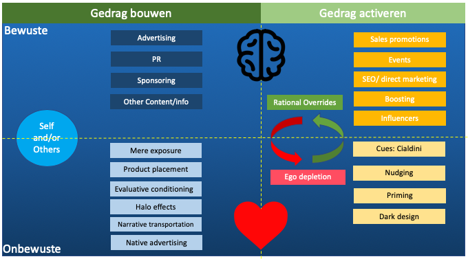 Ik zal een korte toelichting geven op een aantal van de in het model genoemde technieken. Hierbij ga ik er, gemakshalve, van uit dat advertising, pr, sponsoring, contentmarketing, product placement bij ‘gedrag bouwen’ bekend zijn, net zoals sales promotions, events, SEO, direct marketing, influencers, Cialdini-type cues en nudging bij ‘gedrag activeren’. Blijven de volgende technieken over: