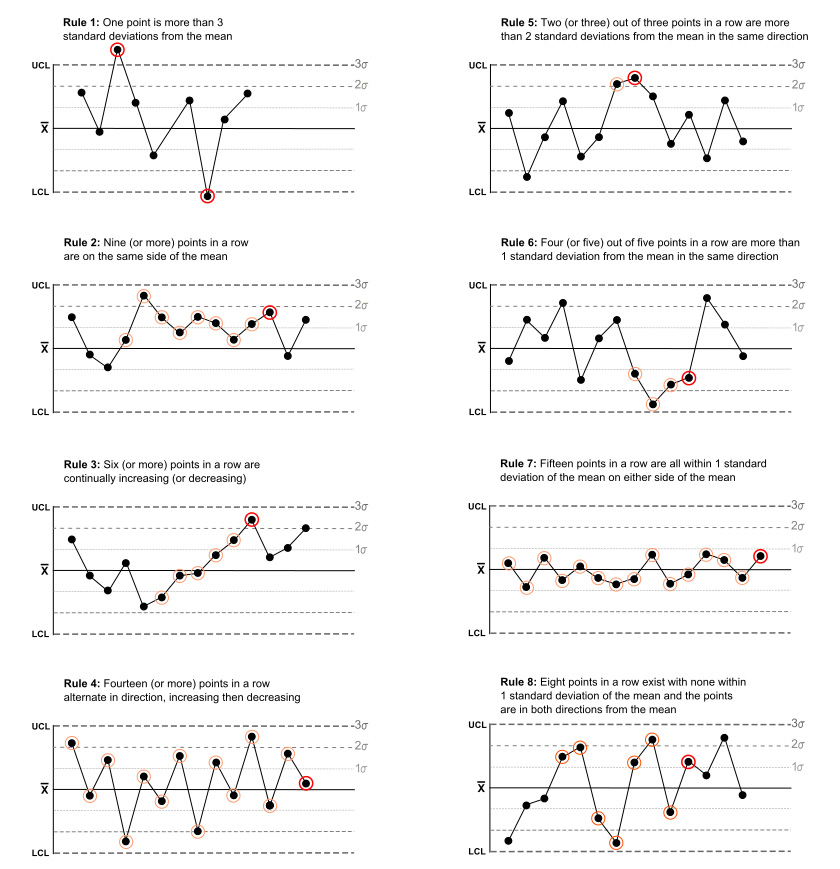- Acht achtereenvolgende punten waarvan geen minder dan één standaarddeviatie af van het gemiddelde en de punten liggen in beide richtingen van het gemiddelde.