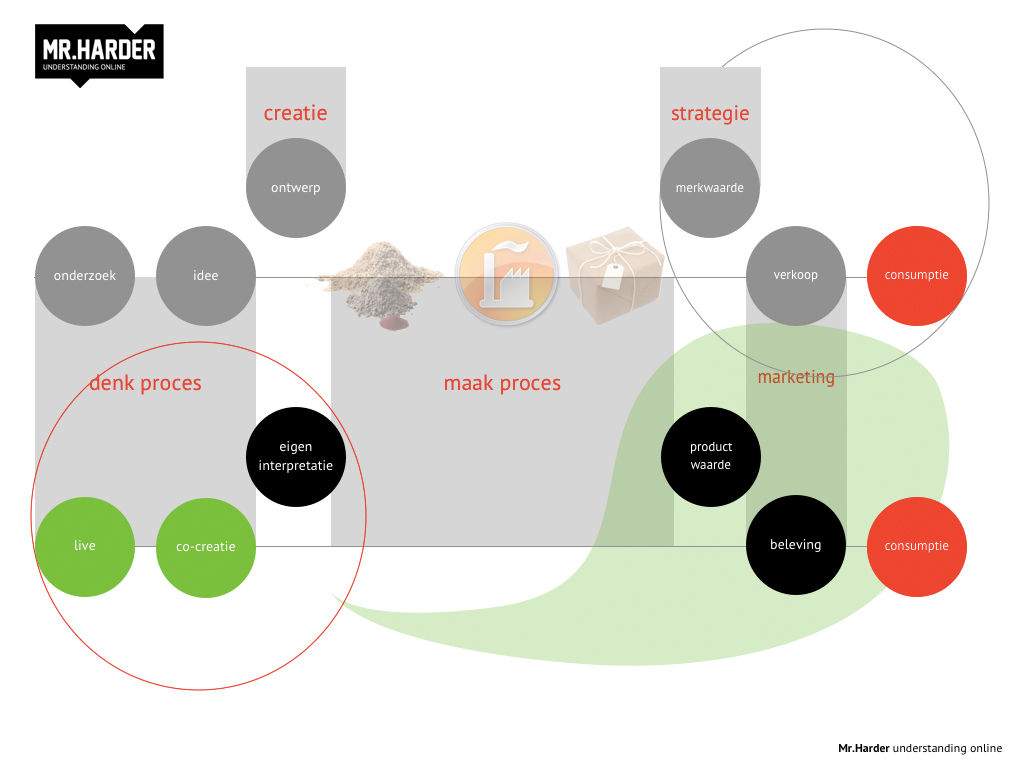 Tijdens een conferentie van ABN AMRO hebben we deze gedachte verwerkt in een lezing die gericht was op de ontwikkelingen van 3D-printing. We gaven aan dat het marketingbudget meestal aan het eind van een cyclus wordt uitgegeven om ervoor te zorgen dat een product aan de man wordt gebracht. Het zou beter zijn om die ruimte aan het begin te geven, waar de klant meekijkt en meedenkt en waar verbinding met het merk vele malen hechter kan zijn. Dit geeft ook kansen voor een verbinding op basis van loyaliteit.