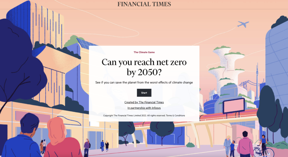 Games zijn soms briljante communicatiemiddelen. Vooral voor onderwerpen die vaak als ‘saai’ of ‘moeilijk’ worden beschouwd. Eigenlijk zouden ze vaker gebruikt moeten worden om mensen te helpen complexe problemen te begrijpen en te benaderen. Deze week is door de FT een spel uitgebracht dat is ontworpen om spelers te laten zien hoe moeilijk het zal zijn om tegen 2050 netto nul te bereiken, en hoeveel moeilijke keuzes wetgevers moeten maken om het doel te bereiken. Het is niet de meest ‘gamey’ game maar gezien de aard van het onderwerp is het een goede poging om een zekere mate van interactie en keuzevrijheid toe te voegen aan het probleem. Een mooi voorbeeld van hoe je op een relatief goedkope manier educatieve /verklarende games kunt inzetten om een breder publiek te betrekken.