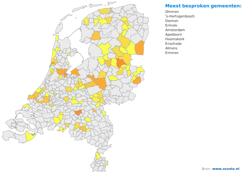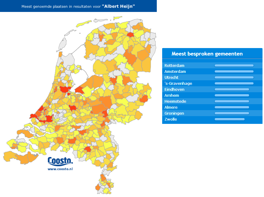 Tot slot is er nog één interessant inzicht dat ik met jullie wil delen. Door te zoeken op “Nieuwe Albert Heijn” genereert Coosto veel resultaten waarin wordt gesproken over een filiaal dat is geopend. Afgelopen jaar zijn de onderstaande tien plaatsen het vaakst genoemd in relatie tot “Nieuwe Albert Heijn”. De integratie van geografische analyse zorgt ervoor dat je gemakkelijk informatie krijgt over welke filialen veel worden besproken, door wie en bovenal: waarom? De mogelijkheden zijn grenzeloos.
