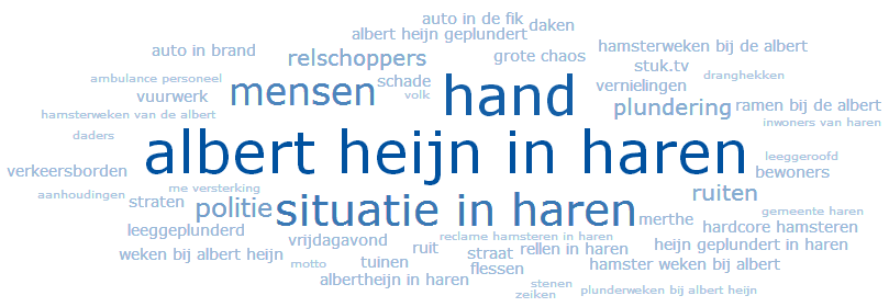 Wanneer ik de tijdsperiode van één maand naar zes maanden vergroot (en het aantal berichten dus ook flink toeneemt), zie ik Haren opdoemen als één van de plaatsen waar vaak over Albert Heijn wordt gesproken. Kijkend naar de trending topics van Albert Heijn in combinatie met Haren, is direct duidelijk dat een gesneuvelde Albert Heijn tijdens Project X zorgt voor deze enorme hoeveelheid berichten over Albert Heijn in combinatie met Haren.